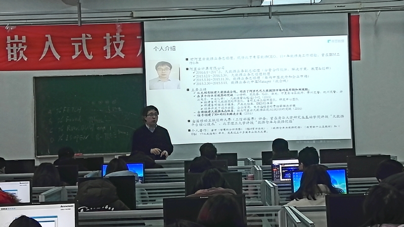 下午,程总为软件技术、计算机网络专业的师生作了两场学术报告,报告题目为:互联网+大数据/人工智能创新。学术报告内容包括:全球大数据和AI人才现状、云和大数据驱动AI的发展、我国高校大数据和AI现状、阿里云大数据介绍主阿里云大数据工程师成长路线图等。程总同时也分享自身及团队的成长经历,整个报告内容翔实,高屋建瓴,对于有志于大数据行业的师生触动很大。