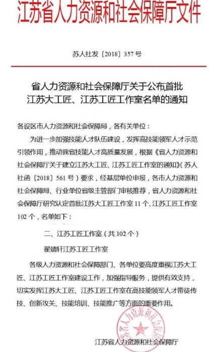 近日,江苏省人力资源和社会保障厅公布了首批江苏大工匠工作室、江苏工匠工作室名单(苏人社发[2018]357号),江苏大工匠/工匠工作室是省人社厅为进一步加强技能人才队伍建设,发挥高技能领军人才示范引领作用,推动我省技能人才高质量发展而设立,本次共认定江苏大工匠工作室11个、江苏工匠工作室102个。公司“江苏工匠”翟靖轩申报的“江苏工匠工作室”通过审核和认定入选了江苏工匠工作室,为公司新增一项省级高技能人才创新和培育平台。