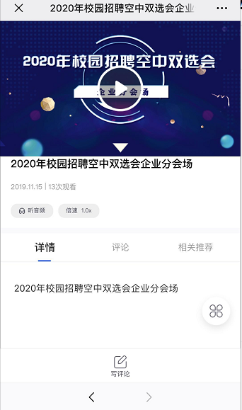员工们进去后不要慌张,待2020年校园招聘空中双选会正式开始(开始时间为3月31日9:00-15:00),可扫下图二维码进入首页,在2020年3月31日校园招聘空中双选会(目前扫码观看不了,只能看到倒计时和海报以及其他地域的空中招聘)