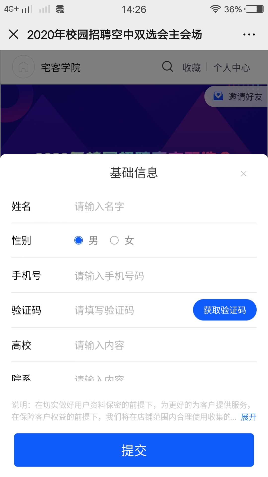1)、在企业招聘专场中选择你要进入的专场,点击进入,然后输入手机号,输入正确验证码,选择对应的性别按钮,输入所在高校及专业,核对准确无误后,点击“提交”按钮,就可以进入专场啦!