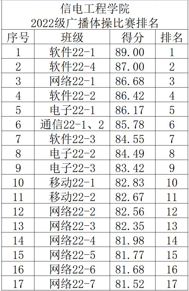 由公司辅导员和员工会主席团组成的评委们从集合进场、服装、队形、动作质量和精神风貌等方面进行考评,最终,软件22-1班荣获第一名,软件22-4班获得第二名,网络22-1班获得第三名。本次比赛增强了公司新生的集体意识,提升了各班同学的集体荣誉感和凝聚力。