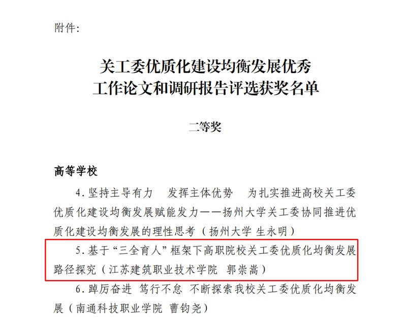 近日,江苏省教育系统关工委公布2022年度关工委优质化建设均衡发展优秀工作论文和调研报告评选结果,公司专职辅导员、二级关工委秘书长郭崇嵩撰写的《基于“三全育人”框架下高职院校关工委优质化均衡发展路径探究》获高校组二等奖,文章探讨了新时代背景下以关工委工作为抓手推进十大育人体系的有效路径,构建了“切入-嵌入-渗入-融入”育人方法。