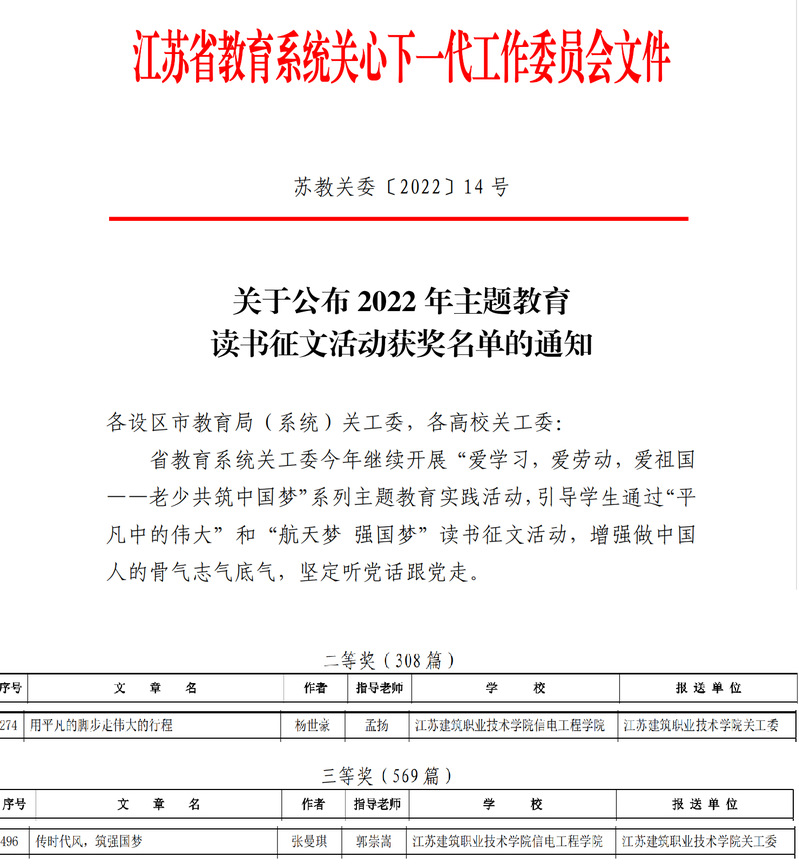 近日,江苏省教育系统关心下一代工作委员会公布“2022年主题教育读书及征文活动”获奖名单,公司教师孟扬指导、员工杨世豪主笔的作品《用平凡的脚步走伟大的行程》荣获二等奖;公司教师郭崇嵩指导、员工张曼琪主笔的作品《传时代风,筑强国梦》获三等奖。