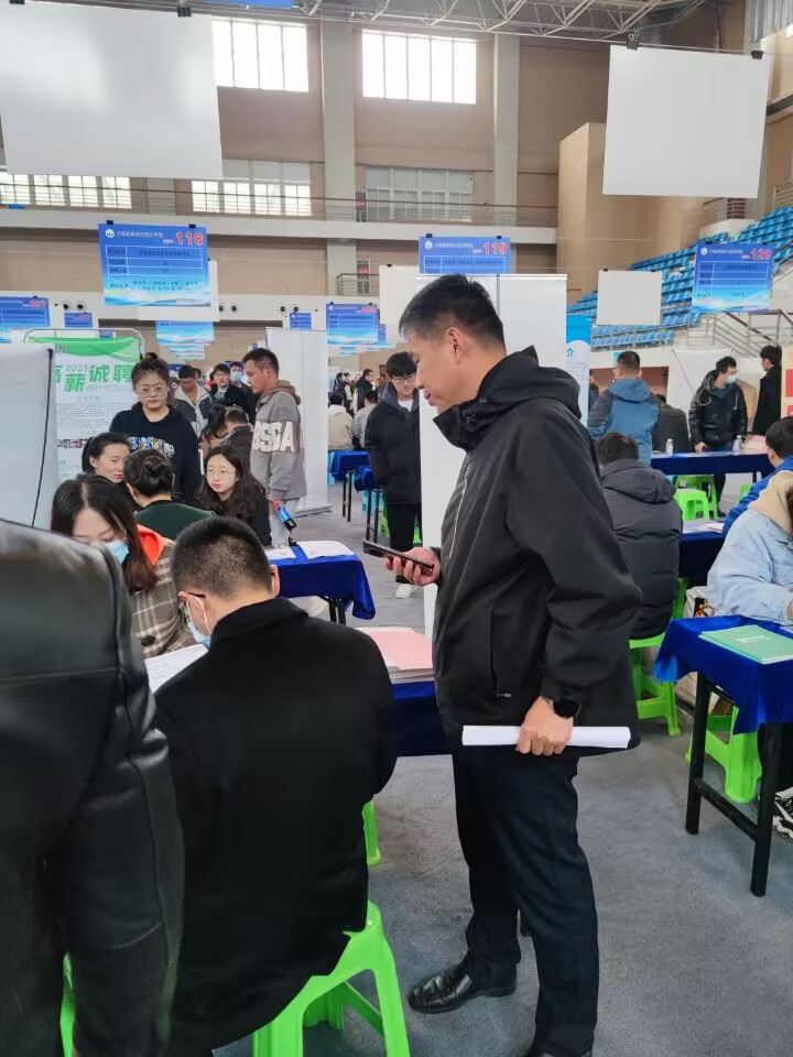 会后,在公司老师的带领下,所有员工统一到体育馆参加2023年春季校园招聘会。