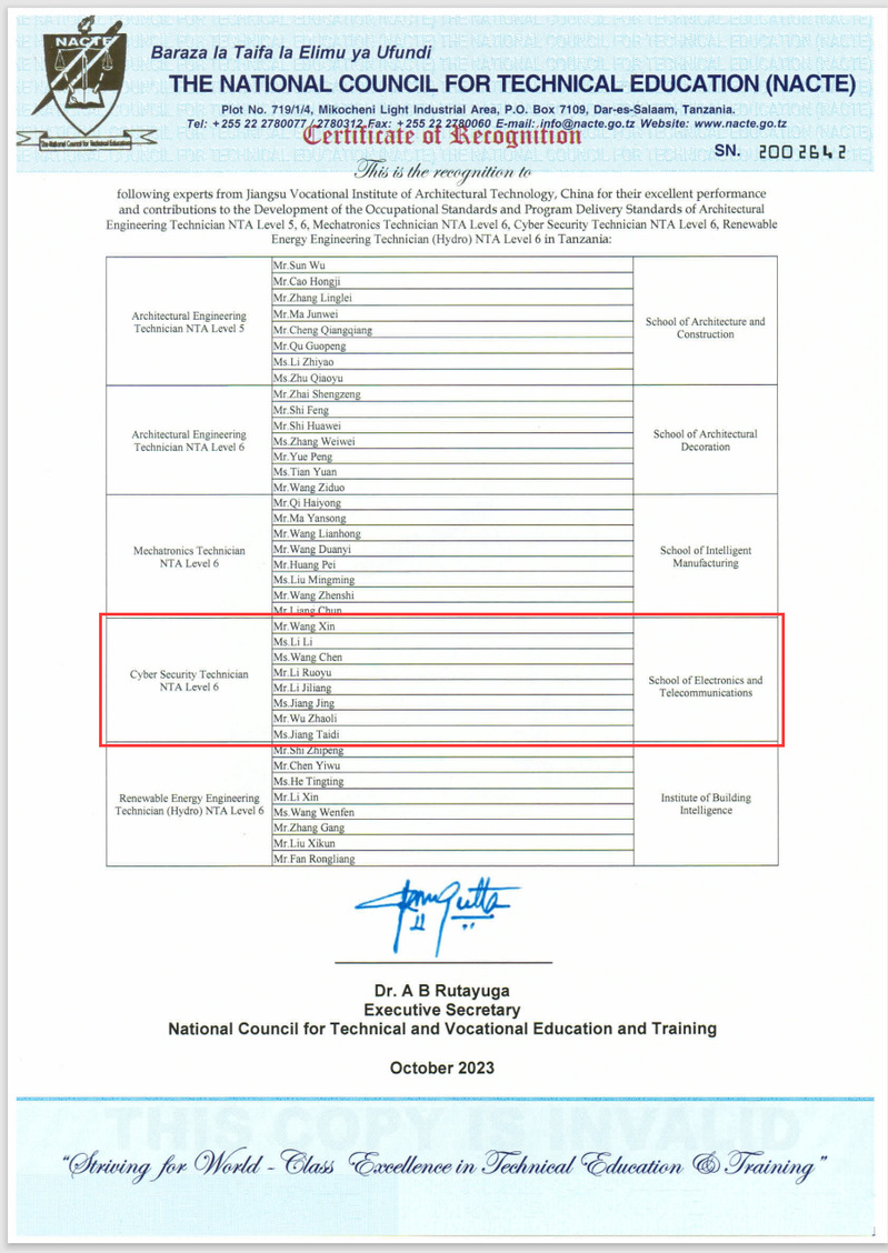 2023年11月,由公司牵头、参与申报的中非职业教育联盟第二批“坦桑尼亚国家职业标准开发项目”之“网络安全技术员NTA6”职业标准项目已经顺利完成结题,并获得结题证书。