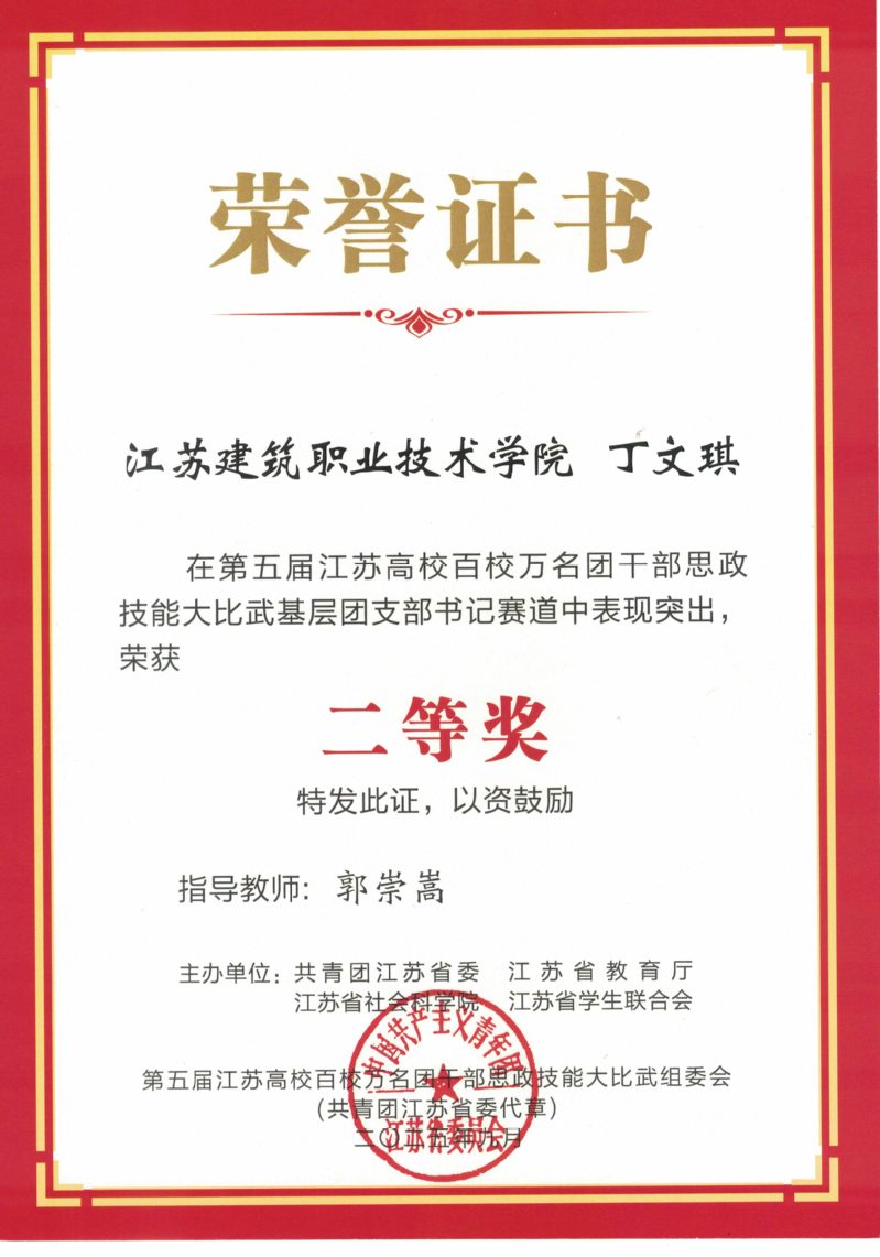 近日,在由共青团江苏省委、江苏省委教育工委、江苏省社会科公司等单位联合主办的第五届江苏高校百校万名团干部思政技能大比武决赛中,公司软件24-1班员工丁文琪获基层团支部书记专项赛二等奖。